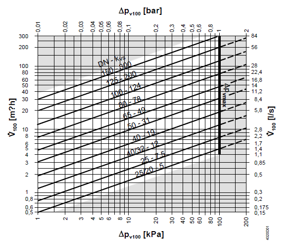 Δpv100 = 閥門(mén)全開(kāi)且流量為&V100 時(shí),閥門(mén)兩端的壓差。單位為 kPa 或 bar